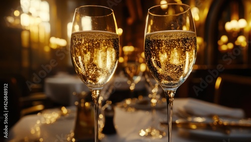 champaign, goggles, drink, sparkling, wine, alcohol, celebration, toast, eatery, table, gold, luxury, elegant, fancy, glassware, beverage, bubble, party, event, festive, anniversary, gold, interior, blurred background, bokeh, light, transparent, clear, liquid, refreshment, occasion, cheer, dining, service