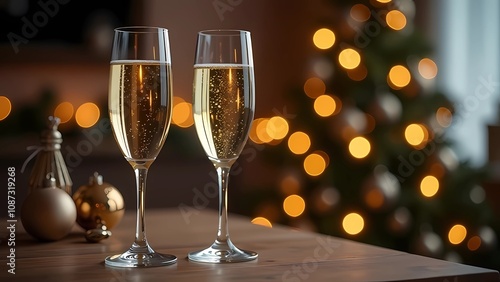 Two champagne glasses filled with sparkling wine. Christmas trees with twinkling lights blur in the background