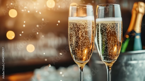 Two champagne glasses invite a toast against a backdrop of soft, twinkling lights symbolizing celebrations and valuable moments of joy and companionship.