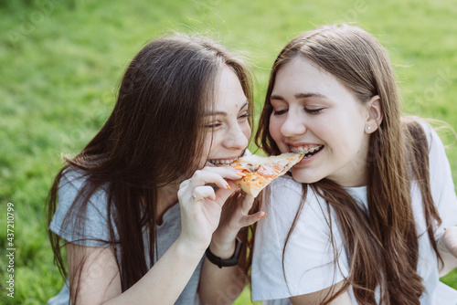 Two cheerful young teen friends in the park eating pizza. Women eat fast food. Not a healthy diet. Soft selective focus.