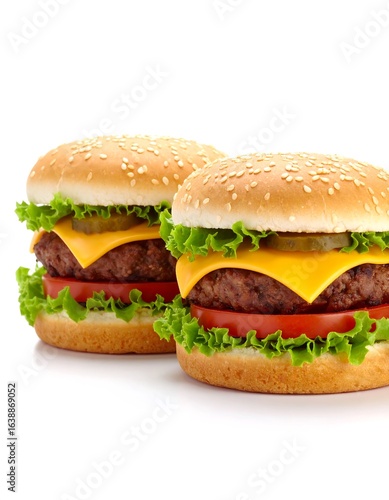 cheeseburger, burger, beef, patty, cheese, lettuce, tomatoes, pickle, bun, sesame, seed, food, meal, fast, delicious, tasty, juicy, fresh, white, background, isolated, closeup