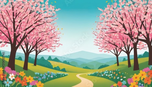 Two cherry blossom trees frame a peaceful path in a colorful meadow, creating a serene spring landscape filled with vibrant flowers and a clear sky.