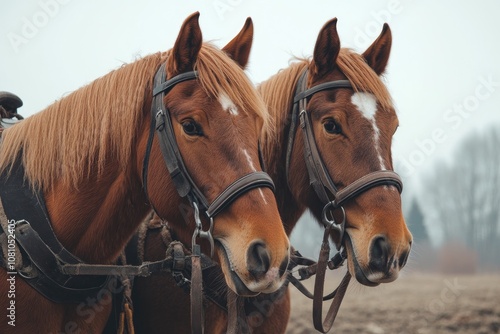 horse, horse, chestnut, bridle, harness, paddock, field, farm, agriculture, farm animal, equine, animal, mammal, rural, country, countryside, outdoors, nature, 2, pair, together, portrait, head, head, closeup, brown, mane, eye, eye, ear, leather, tack, equipment, farming, farm animal, rural scene, country life, equestrian