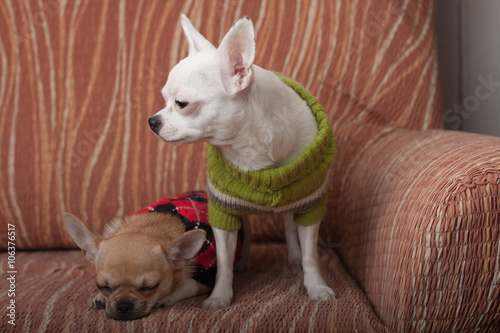 Two Chihuahua dogs dressed with pullovers resting on sofa