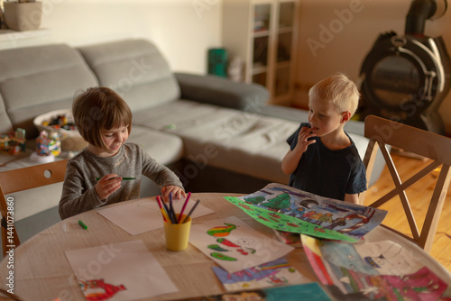 Two children joyfully engaged in drawing activities, surrounded by vibrant and colorful artwork along with various supplies