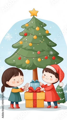 children, present, christmas, tree, gift, joy, holiday, celebration, festive, unwrap, decorated, smiling, together, playful, seasonal, cheer, colourful, ornament, snowflake, fun, happiness, family, winter, red, green, gift box, friendship, playtime, tradition, merry, joyful, cute, happy, spirit