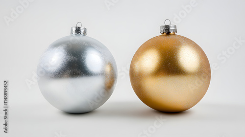 Two classic Christmas ornaments, one silver and one gold, sit side-by-side against a clean white background. Perfect for holiday themes.