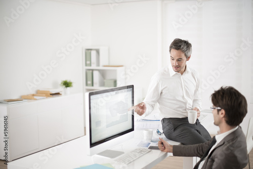 two colleagues speaks about business at office in front of compu