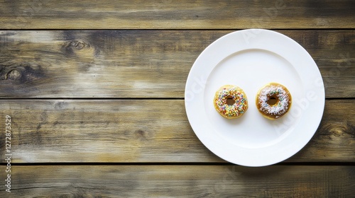 Two Colorful Donuts with Sprinkles on a White Plate on Rustic Wooden Table