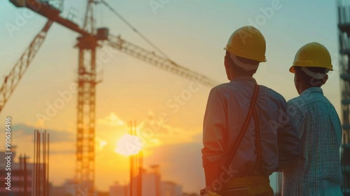 construction, men at work, sunset, silhouette, crane, hard hat, helmet, building, site, project, sky, gold, horizon, industry, job, team, teamwork, safety, engineering, infrastructure, progress, development, future, city landscape, urban, industrial, background, labor, work, evening, dusk, view, day, yellow, orange, blue, red, brown, metal, steel, concrete, beam, frame, structure, rebar