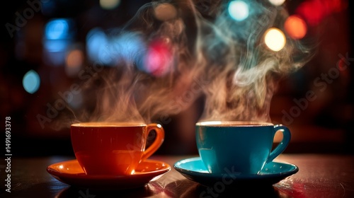 hot drink, cup, 2, hot, cafes, modern, beverage, drink, 2, cup, cappuccino, latte, espresso, photo, pair, caffeine, eatery, fashion, style, premium, bokeh, contrast, high, commercial, morning, breakfast, mug, mug, saucer, spoon, table, black, background, served, ready, closeup, closeup, closeup, view, appetising, epicure, steam, tea, aroma, smoke, warm