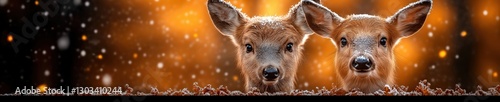 Two curious fawns peek through colorful autumn foliage in a serene forest at dusk