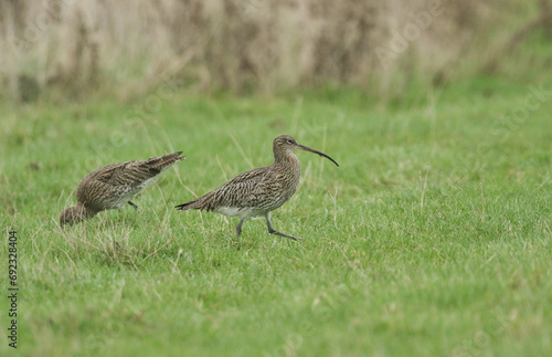 Two Curlews, Numenius arquata, feeding in meadow in autumn.