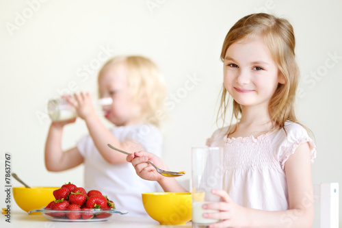 beautiful, bowl, breakfast, caucasian, cereal, cheerful, children, childhood, corn, cute, diet, domestic, drink, eating, face, female, flake, food, friends, fruit, fun, girl, glasses, happiness, happy, healthy, holding, home, ravenous, indoor, interior, kitchen, little, lunch, milk, morning, people, kindergartner, sibling, sister, small, smiling, snack, spoon, strawberry, table, together, 2, white, yellow