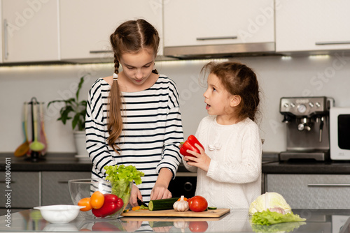 Two cute sisters' girls cut a salad from fresh vegetables. The girls are in the kitchen at home. They socialize and have fun while cooking. The concept of healthy eating. Healthy food. Childhood.