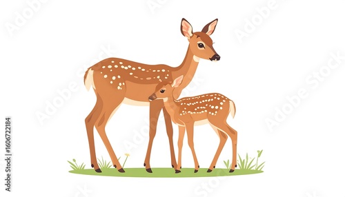 cervid, fawn, mother, calf, animal, wildlife, nature, grass, meadow, cute, illustration, cartoon, brown, spotted, mammal, young, standing, gentle, protection, care, family, forest, habitat, warm, tender, adorable, portrait, flat, vector, graphic, design, peaceful, spring