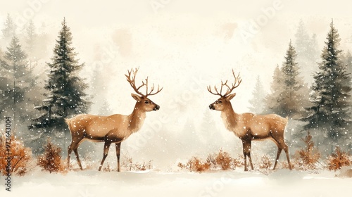 cervid, forest, snow, nature, wildlife, winter, landscape, tree, animal, serenity, calmness, habitat, outdoors, environment, flora, fauna, peaceful, scenery, antler, brown, white, cold, season, beauty, wilderness, ecosystem, snowflake, branch, foliage, rustic, gentle, majestic, natural, artistic, illustration, calm, picturesque, symmetry, harmony, soft, colours, wintery, aethereal, quiet, enchanting, scenic, roam, grazing