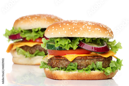 Two delicious hamburgers isolated on white background