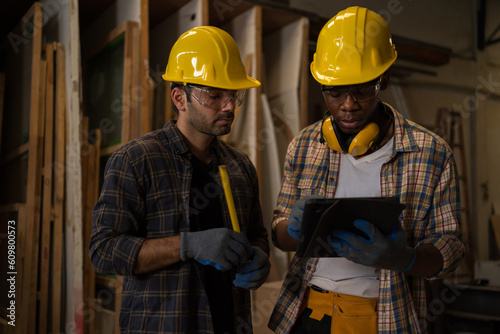 Two diversity professional craftsman or carpenters wear safety equipment. They're talking about woodworking and looking at models from tablets or laptops in Carpenter and wood craftsmanship concept.