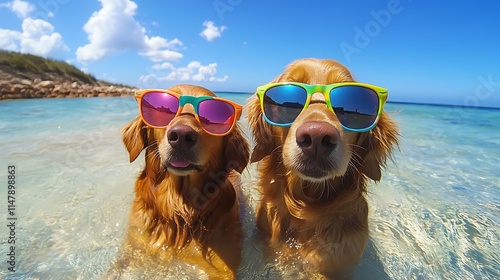 Two dogs posing in colorful sunglasses under the sun near calm clear ocean waters