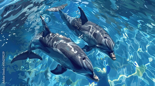 Two dolphins are swimming in a blue ocean The water is clear and calm The dolphins are playing and enjoying their time in the water