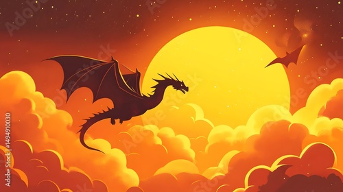 dragon, fantasy, sunset, sky, cloud, fire, majestic, powerful, flying, wing, silhouette, orange, yellow, night, star, magical, mystical, legend, fairy tale, epic, dramatic, vibrant, colourful, artwork, illustration, art, digital artwork, graphic, design, creative, imagination, dreamlike, mysterious, wonder, adventure, flight, freedom, power, grace, beauty, awesome, spectacular, intense, fiery, glowing