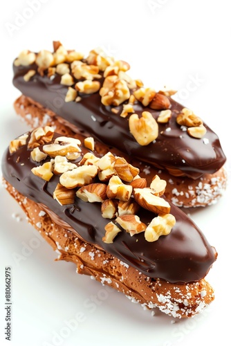 2, eclair, chocolate, frost, nut, top, dessert, sweet, pastry, almond, light, pecan, high, rich, dine, art, fine, white, walnut, cake, shot, treat, french, close, tempt, love, milk, fresh, custard, taste