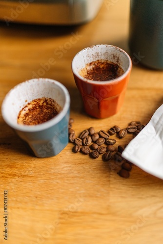 Two espresso cups with coffee beans on a wooden table