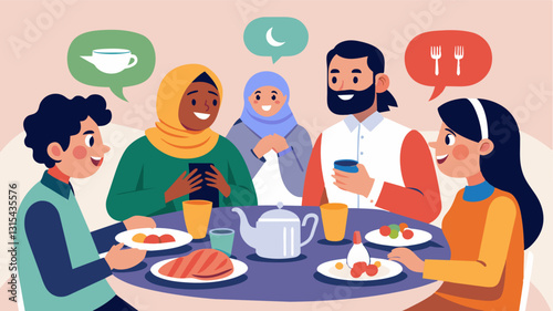 Two families from different countries are paired up through a language exchange program and take turns hosting dinner gatherings where they can practice speaking each others. Vector illustration
