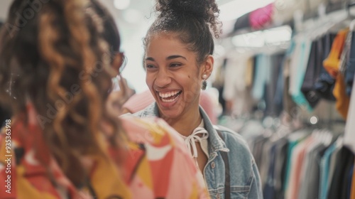 friends, shopping, laughing, happy, retail, store, friendship, woman, girl, young, fashion, clothes, boutique, shopping centre, mall, smiling, cheerful, casual attire, happiness, joy, togetherness, connection, bonding, lifestyle, female, woman, girl, style, trendy, outfit, apparel, fun, excitement, sale, discount, purchase, consumerism, consumer, closet, clothes rack