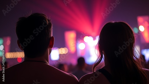 Two festival attendees enjoying music with colorful lights and a soft ambient glow around them.