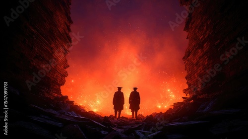 red, grim, disaster, ancient, apocalyptic, scene, dark, ruin, soldier, light, silhouette, intense, war, 2, confrontation, orange, flames, night, epic, smoke, atmosphere, figure, dramatic, military, debris, wall, standing, historical, fire, conflict, powerful, landscape, burning, destruction