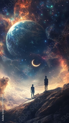 Two figures stand on rocky terrain, gazing at a crescent moon and a nearby planet, surrounded by a vibrant cosmic landscape. Ideal for themes of exploration, unity, and the mysteries of the universe