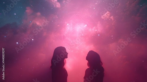 Two figures standing together gazing at a stunning galaxy, a scene filled with soft pink and purple hues, reflecting on togetherness, hope, and infinity.