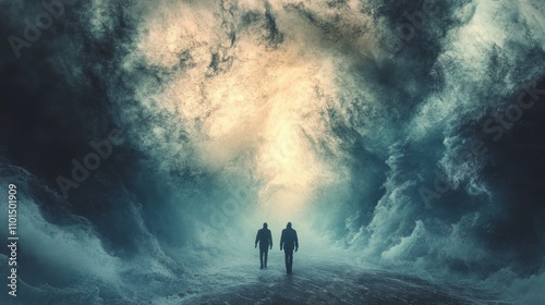 Two figures walk towards a bright light through a dark, stormy, cloudy landscape.
