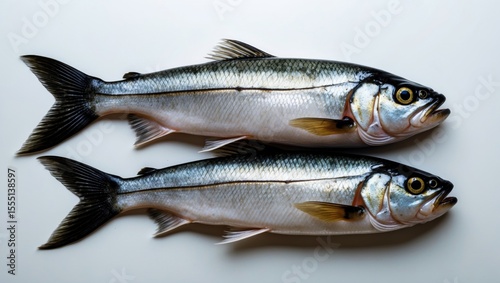Two fish placed side by side on a plain surface.
