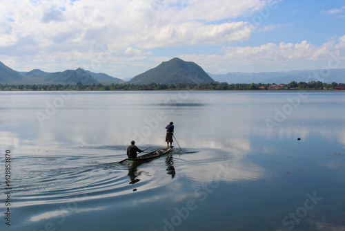 Two fishermen in a long, narrow canoe in a still lake in Myanmar.