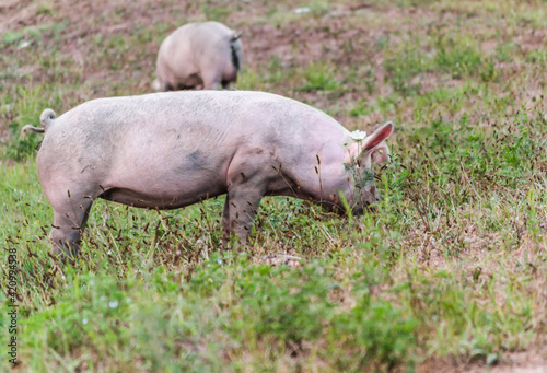 Two free pigs on a clearing in the pasture, in front of the forest.
