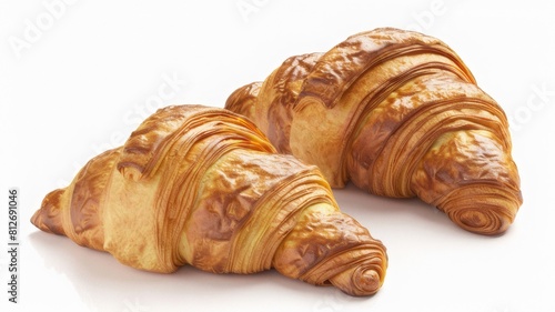 Two fresh French croissants isolated on white background