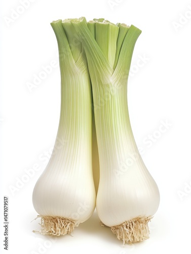 Two Fresh Leeks Standing Side by Side on White Background Close Up Studio Shot of Whole Leeks Healthy Eating Ingredient