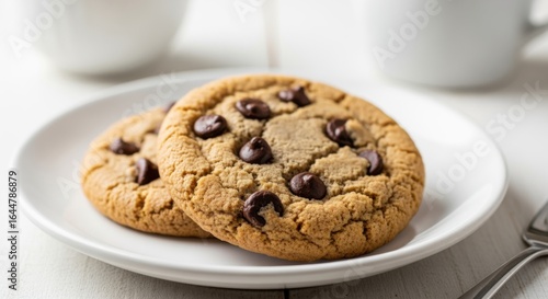 Two freshly baked chocolate chip cookies displayed on a white plate, conveying comfort food vibes.