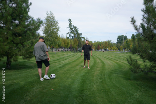 Two friends are playing soccer on a lush green lawn in a park, practicing their skills while enjoying the warm sunshine and fresh air. The atmosphere is relaxed and fun