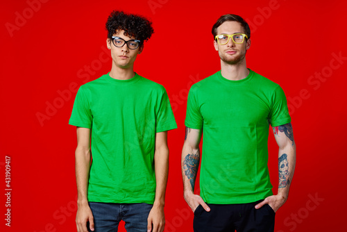 two friends are standing side by side in green T-shirts with glasses
