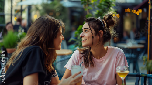 friends, cafes, drink, conversation, greenery, evening, socialising, laughter, relaxation, ambience, casual attire, friendship, patio, nature, fun, lifestyle, bonding, woman, leisure, urban, chill, refreshing, cafes, beverage, summer, dining, social gathering, happy, enjoyment, fashionable, trendy, night out, community, young adult, scenic, woman, people, smiling, couple, talking, student, 2, student, together, girl