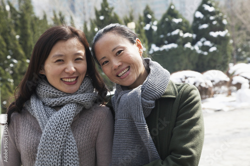 season, snow, winter, discovery, togetherness, horizontal, two people, long hair, brown hair, casual clothes, warm clothes, foulard, coat, glacé, nature, pine tree, smile, smiling, embracing, standing, bonding, friendship, satisfaction, happiness, enjoyment, joy, cheerful, beijing, china, outdoors, day, avocation, vacation, lifestyle, front view, color image, series, photo