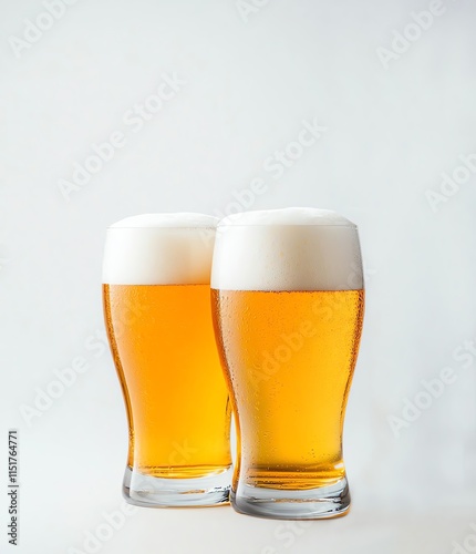 Two frosty glasses of amber beer with generous foam heads, isolated on a white background, highlighting their refreshing texture and appeal.