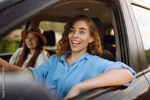 Two fun young women driving in a car in town laughing and smiling as they socialise together. Travel, tourism.