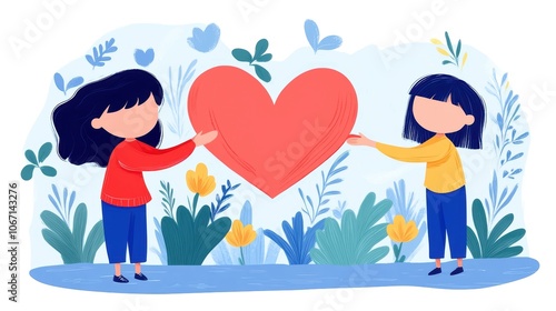 Two girls holding a heart surrounded by colorful plants and flowers.