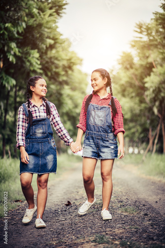 walking, forest, 2, girl, road, little, girl, young, hand, beautiful, friends, holding, together, hand, autumn, cute, sun, happy, nature, lifestyle, female, summer, park, childhood, children, sister, happiness, friendship, walk