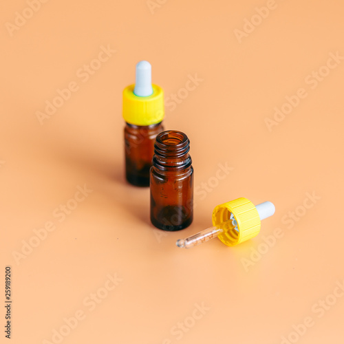 two glass dropper serum bottle on orange background with clipping path ready for cosmetic product design or medical for nose